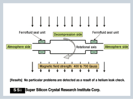 超過300mm的大型結晶體生產提煉時,因為需要強大的MCZ式磁場和尖端領域的系統電源,所採用的磁流體密封的條件是以絕對不能受磁場的影響為前提。理學磁流體密封裝置的獨特構造耐磁場性強,在SSI研究所提煉出了400mm的晶圓柱體,技術實力得到充分證實。