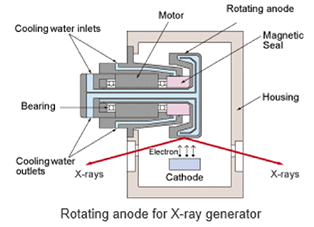 X射線發生器的原理是在高真空中,通過電子與高速旋轉靶的碰撞而產生X射線。